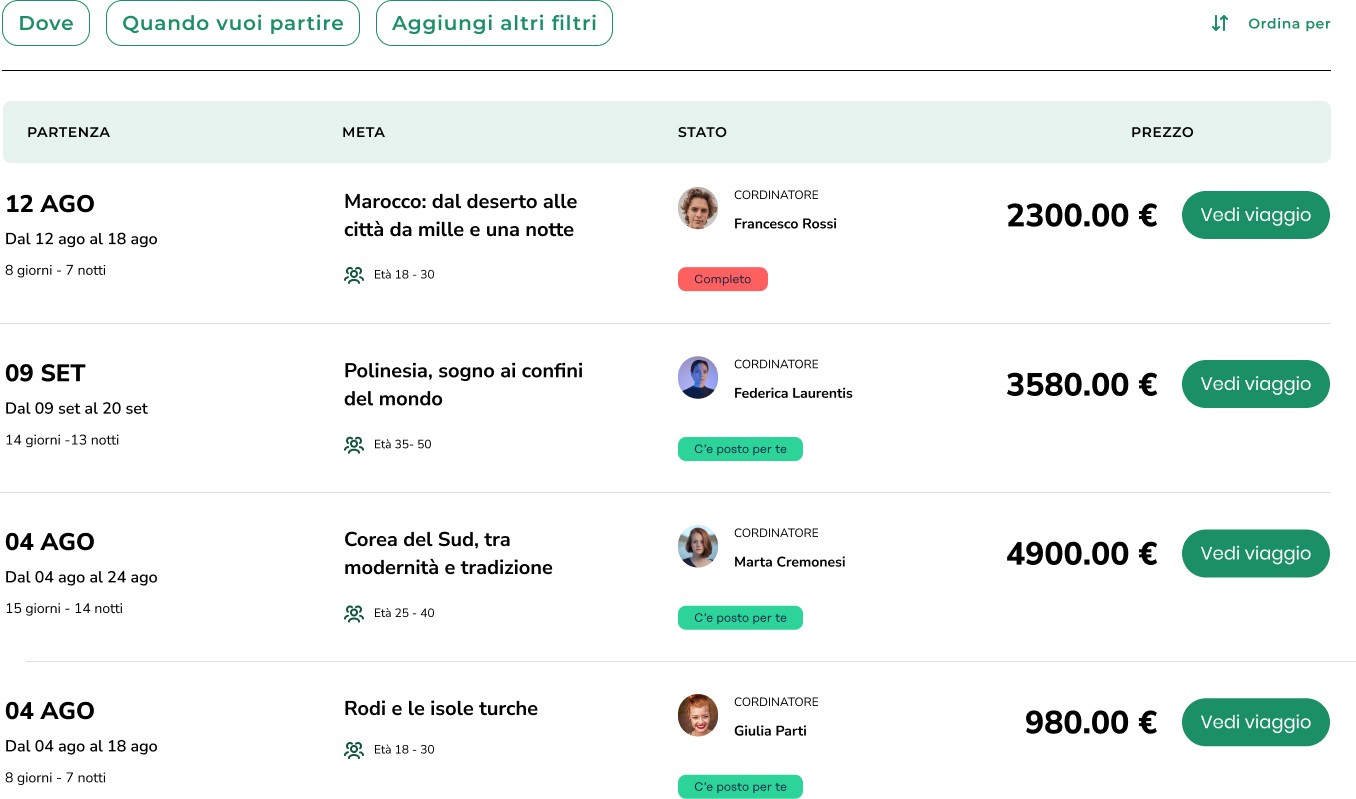 Each section guides the user through a visual and emotional journey, facilitating the discovery of destinations and offers.