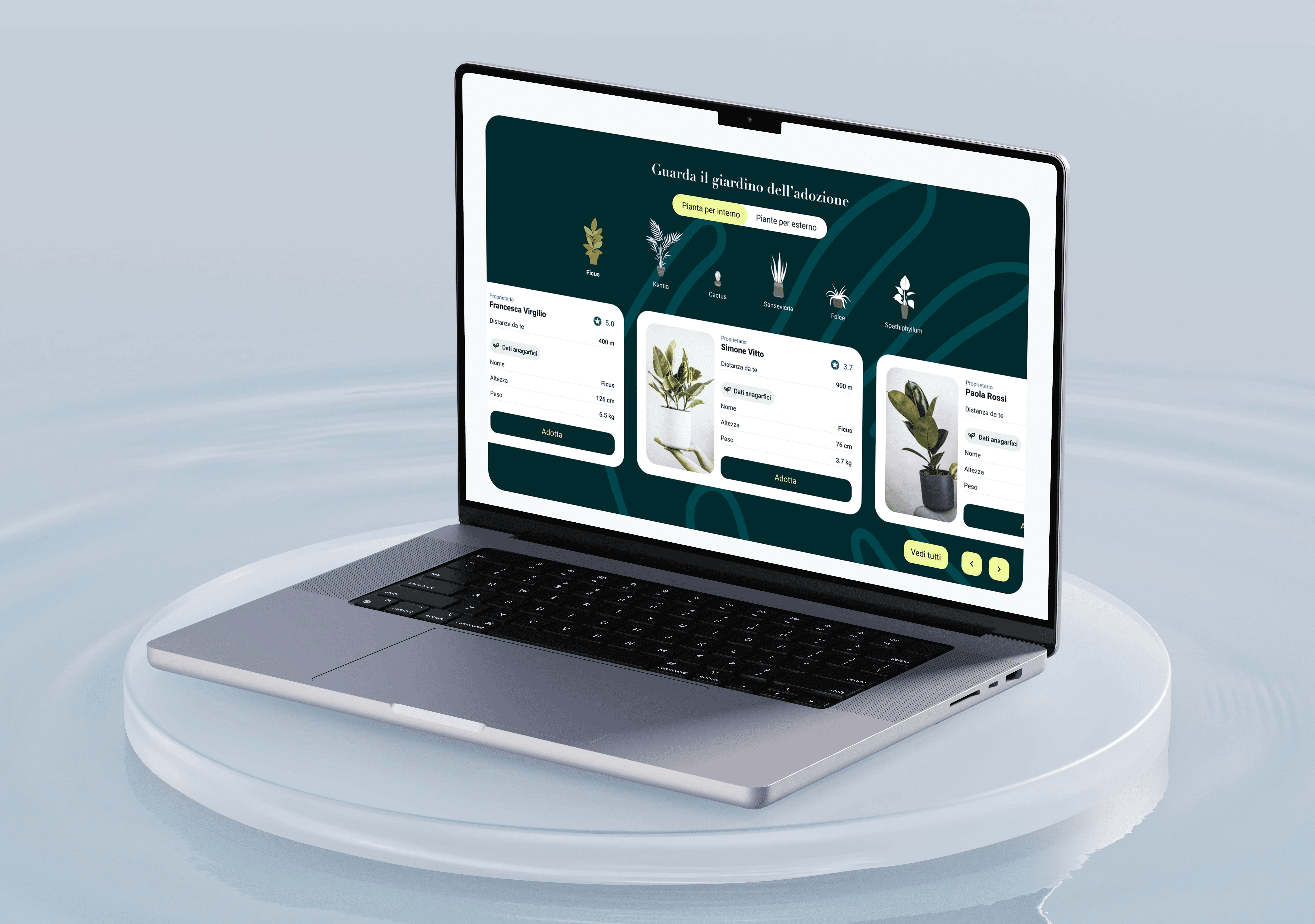 Interactive cards, filters, and a clear visual hierarchy facilitate the selection and adoption of nearby plants, with quick access to details and additional information.
